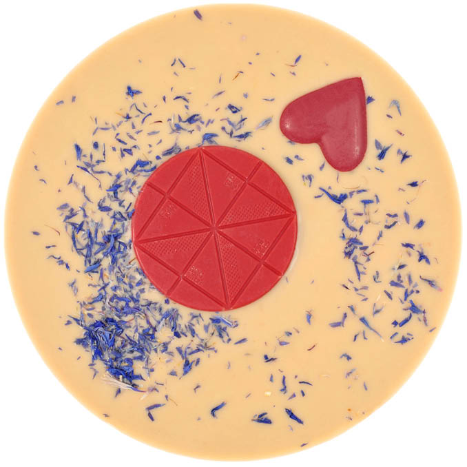 Weiße Schokolade° dekoriert mit Erdbeer-Kakaobutter-Scheibe°(14%) und Himbeer-Kakaobutter-Herzerl°(3%)